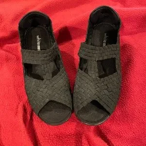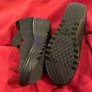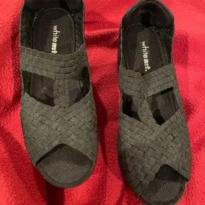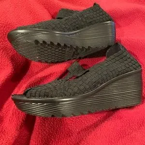 A cute pair of platform sandals made of a stretchy woven fabric. They are lightweight, as they are composed of man-made materials. Heel is about 2". I bought them and never wore them, although they are very comfortable. Now it's flats only for this gal! :)