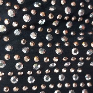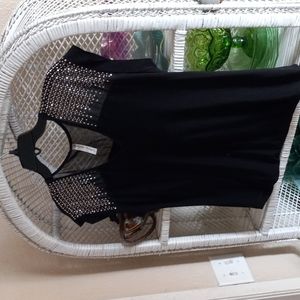 Very pretty flowey blouse. Nicely made with gold and silver sparkles at the shoulders. Easy pullover styling. New never worn. The tag is marked small but it can fit medium. Measures about 19" armpit to armpit. Length from top of back neck to hem 24 1/4". Has shirt tail hem.