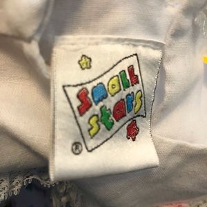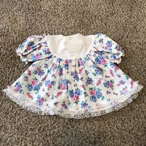 So adorable. Ruffles, flowers - this would be so cute for Easter. It is more of a top than a dress, tiny bit short but might work with ruffled shorts too. 12” long.