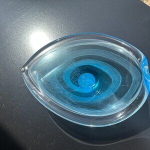 A CRISTALLERIA TOSCANA GLASS CANDY DISH, LIKELY DATING FROM THE MID-20TH CENTURY. CRISTALLERIA TOSCANA IS KNOWN FOR PRODUCING HIGH-QUALITY GLASSWARE, OFTEN FEATURING UNIQUE DESIGNS AND VIBRANT COLORS. THIS PARTICULAR PIECE SHOWCASES A SWIRL PATTERN OF BLUE AND CLEAR GLASS, CREATING A VISUALLY APPEALING AND DECORATIVE OBJECT. THE BOWL'S SHAPE IS ASYMMETRICAL, WITH A POINTED END AND A CURVED OPENING, ADDING TO ITS ARTISTIC FLAIR. THE BOWL COULD SERVE AS A DECORATIVE PIECE OR FOR HOLDING SMALL ITEMS, AND IT IS AN EXAMPLE OF THE CRAFTSMANSHIP ASSOCIATED WITH ITALIAN GLASSMAKING.