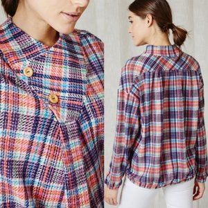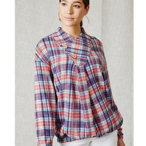This stylishly textured plaid top is perfect for any outfit. It features a button collar, colorful plaid pattern, and elasticized hems for comfort and to keep the fit relaxed. Made with long sleeves for protection, you'll be able to wear it all year round.