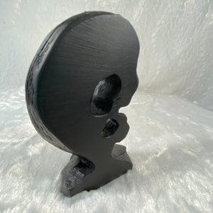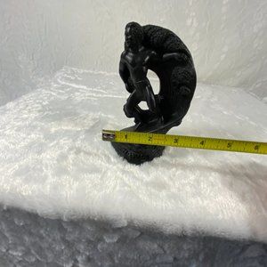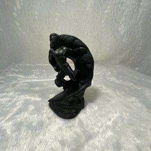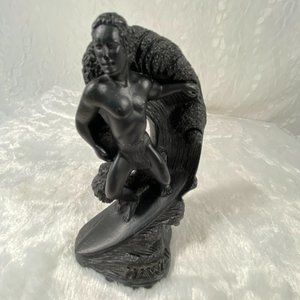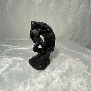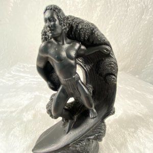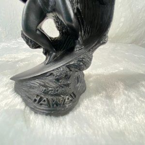 This Vintage Coco Joe’s figurine is made from pulverized lava mixed with resin. It depicts a man riding a surfboard with a large wave curling over him.