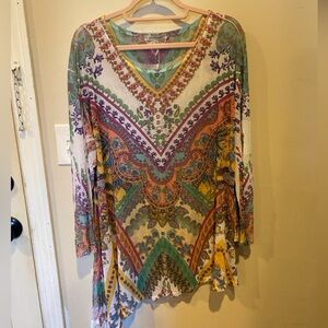 Pretty colors and falls nicely. Feels silky. In great condition and no stain Elastic waist and drawstring tie with shells on them.