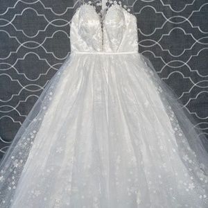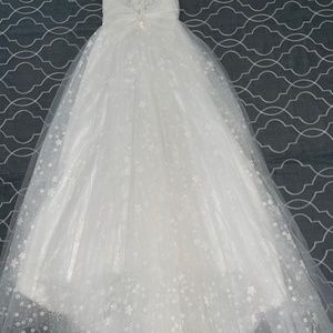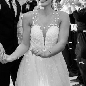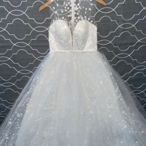 Glamorous, tulle wedding ball gown with glitter and white flowers. The dress has a bow that attaches in the back and also a bit of train.