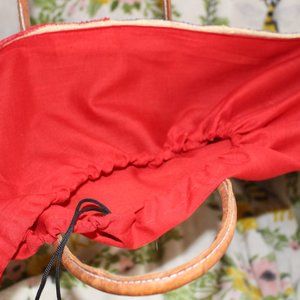 A pretty American Flag Themed Beach Tote and/or Handbag. Red cloth along top that has a drawstring to close. You can pack more beach stuff in this than actual size as the red fabric does extend upwards. Tag inside bag looks like it states: LeCamptain. (I could be wrong with spelling) Tag states Natural Fibers. Not sure if wicker? Handles and bottom corner tips appear to be leather but a chance it could be faux leather. There is lots of detail to this bag. The front has red and tannish stripes. The stars appear to be embroidered or similar to it. Back is not decorated. Handles are sewn on as well as corners pieces. The interior is unlined. The red cloth fabric is stitched onto the inside top edge. Drawstring works fine. Nice feature so your beach stuff isn't able to tumble out of the bag. The approx size: 21" x 13". I bought this in the late 1990's to early 2000's. Between 1995 to 2002. Used a few times only. Condition: The outside is very nice. Not stained, etc. Couple small areas where wicker may be popping up but bag is intact. When you open the bag and look at the bottom of the bag you can see there is another piece of wicker or whatever this material is that is placed over the actual bottom of the bag. This is stitched along inside bottom edge of bag to make it sturdier. If you look closely some of this stitching has come undone. This piece still intact but wanted to mention. Non smoking.
