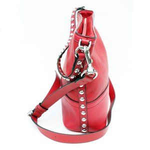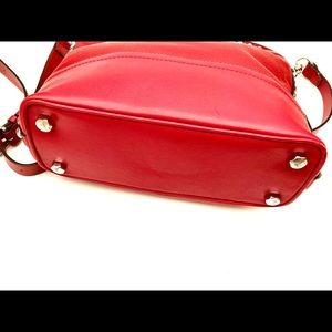 A great everyday red leather bag with chrome studded details. Can be used as a crossbody bag, or remove the strap and use as a handbag. Max drop on the adjustable strap is 22". Three interior slots and a zippered pocket with an overall zippered closure. In very good condition - a bit of wear shows at the base of the bag on the feet and around the piping as pictured in last photo.