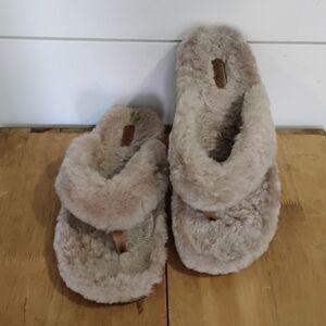 Super cute tan "Happy" Rae Dunn Slippers. Quilted and cushioned insideš