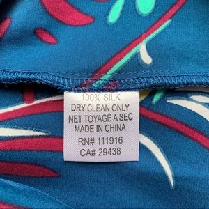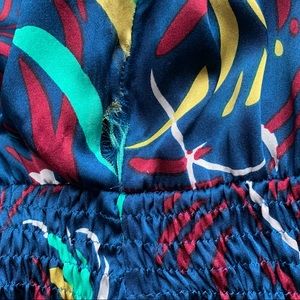 Features: Beautiful silk print, ***there are several flaws where seams are pulled apart-please see pictures***, elastic waist, deep v-neck