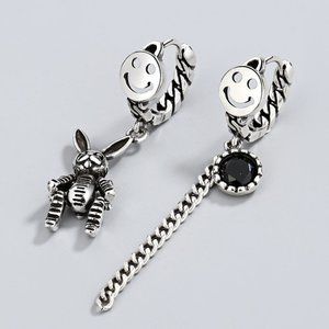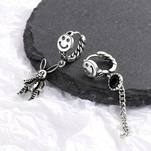 Sterling Silver Asymmetric Smiling Face Rabbit Pendant Earrings.