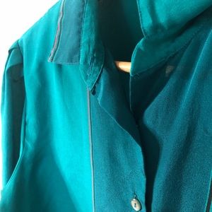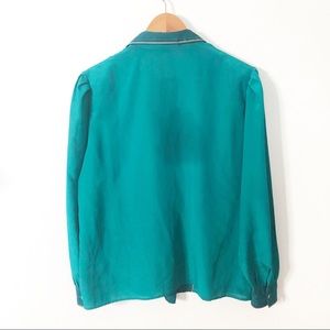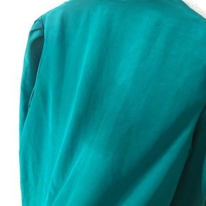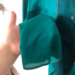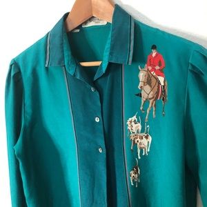 Super unique teal green pullover 1/2 button up long sleeve collared silky lightweight blouse with a jockey on a horse with dogs print