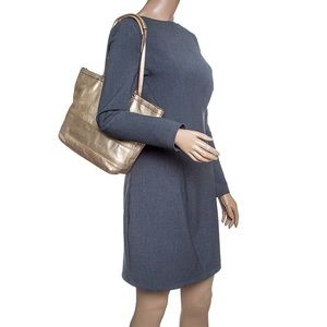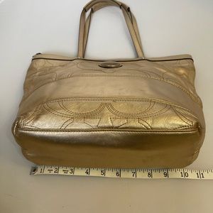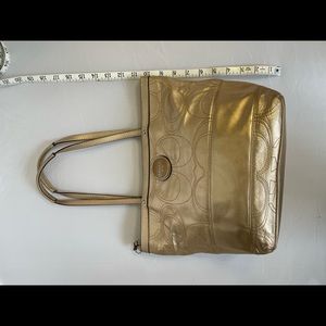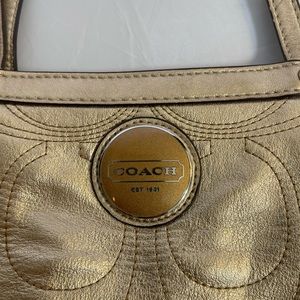 Coach Metallic Gold Signature Stitched Leather Tote. In good preloved condition. Has some scuffs and marks, but still really nice for it’s age. Featuring two handles at the top, gold-tone hardware and signature stitching on the metallic gold exterior, and a satin compartment to house all your essentials. This piece is definitely a good buy.