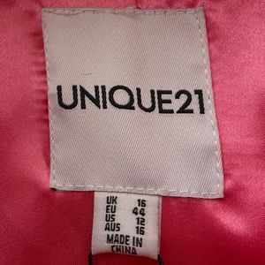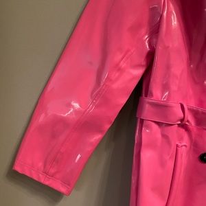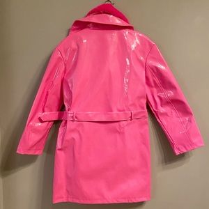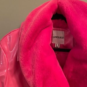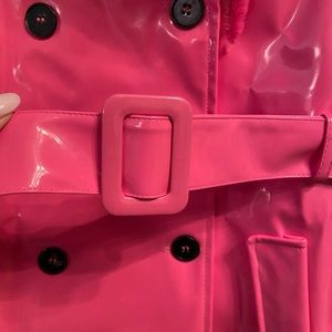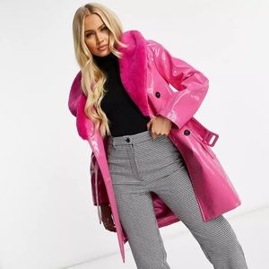 ASOS Unique21 Faux Fur Trim Vinyl Coat in Fuchsia. US size 12 (tag says size 16 but that’s the UK size). Removable belt. Elle Woods/Legally Blonde/Barbiecore feel. This is a vinyl coat so it may show marks, such as a small light imprint on the lower bottom on the back of the jacket as shown in the last picture. (MH22EIH)