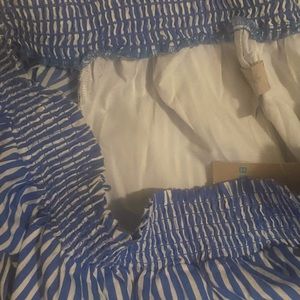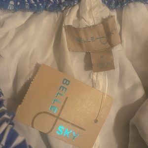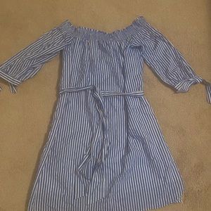 This is a new with tags Belle + Skye blue and white striped off the shoulder dress. It has a belt tie for the waist. The dress measures 32” from the top of the neckline to the bottom of the hem. It has 3/4 length sleeves with a tie at the hem of each sleeve. The dress will ship quickly from a smoke free home.