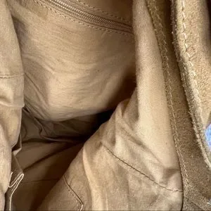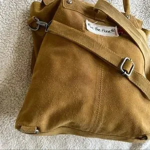 Lovely shape on this suede hippie boho backpack from We the Free a Free People company. Shows only the lightest previous use. Interior very clean with single zip pocket and slip pocket. Exterior has rounded handle, and a convertible shoulder strap. Flap over top with magnetic snap to secure close. Cute piece!! Dark mustard color. H: 13” x base: 11.5”x2.5”