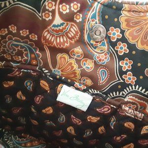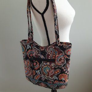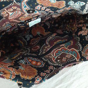 Black/brown/blue paisley pattern - Kensington Curvy Tote - retired pattern; 1 zip inside pouch, 3 open inside pouches, 1 outside zip pouch, snap close; 10 1/2" W, 4 1/2" D, 10" T, 11 1/2" Drop. Structured bottom. Lovely condition!