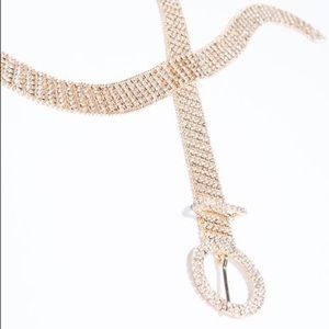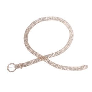 jewelry-inspired waist belt featuring a faux gold base, subtle beaded trim, a rhinestone link fabrication, and a circular buckle fastening.