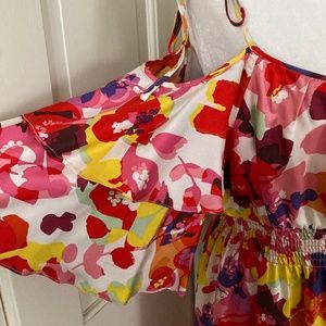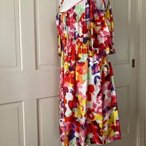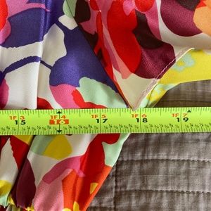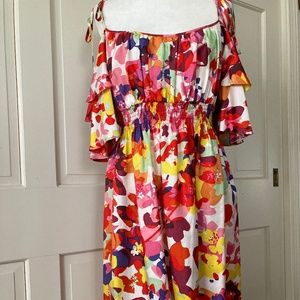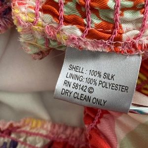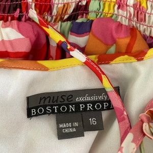 Pretty silk dress by Muse Exclusively for Boston Proper. Slightly scooped neckline. Adjustable spaghetti tie straps and off the shoulder fluted sleeves. Waist is elastic. Beautiful silk floral dress of red blue green yellow pink purple and white. Measurements lying flat are: Pit to pit = approx. 18 inches, Length measured from neckline to hem = approx. 30 inches. The length can be adjusted by the shoulder ties. Dress is 100% SILK, lining is 100% Polyester. SZ 16