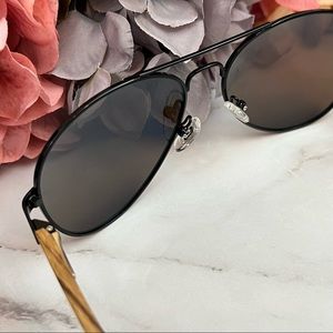 These high quality glasses have black metal rims, beautiful handmade Zebra wood temples, and blue mirrored lenses. Zebra wood comes from several different types of trees, but traditionally from Central America. It is known for its strength and durability, and that distinctive striped grain that varies from light to dark wood. It is a great wood for sunglasses!
