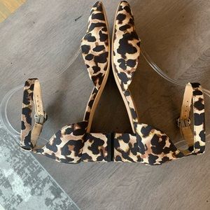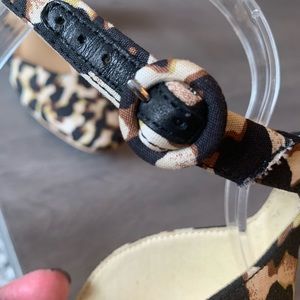 Cabi Kiki Ankle Strap low chunky heel. Sz. 8. Excellent pre-owned condition. Only worn a few times. Leopard print. Cotton exterior (canvas feel), man made interior. Goring at side buckle. Covered chunky heel. Round toe. 2” heel.