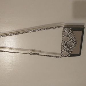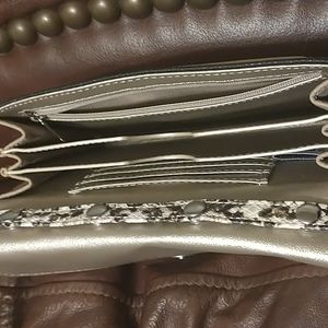 Nine West Crossbody Snake Print Design.One Zip Compartment inside, Five Credit Card Holders, One other Compartments Snap Closure. Beige, Brown, Tan. 7.5 X5 Vinyl. 27' Strap. Excellent Condition!!!