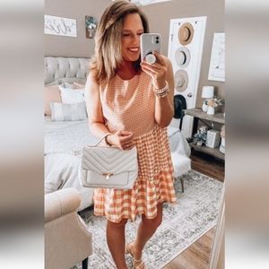 It has gold hardware, front zipper pocket, adjustable straps and interior pocket.