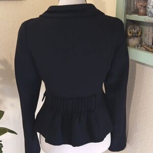 Elegant black jacket made in Italy. So sweet. Beautifully crafted. Velvet trim. One button and a hidden snap. Uniquely gathered on the back. Top stitching. Two pockets on the outside. Beautful full lining . Inside pocket. Measures 34 at chest, 30 at waist, 44 at gathered bottom hem. I'm calling this a 2 Perfect for any occasion, you could try this as a top, also. The cutest jacket in my closet.