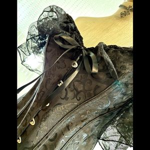 NEW !!!! Large black lace sleeve corset!!! These are just beautiful 🤩 Join the tiktok corset challenge and be a trendy fashionista!! I’ve been seeing a lot of corsets lately on reality shows too. I got started on corsets because of my back issues. But I’m all about Multi-purposing 🤩Medium fits waist size 28.7” and 32.7” bust. Large fits waist size 30.7” and bust size 34.6”. With the little lace sleeves these appear more like a shirt. They pair great with a high waisted jean 🥰 The front is a solid metal clasp. I find the actual corset strong. Please note that the back laces up with ribbon. These corsets are great as a costume or the bedroom. If you would like to wear them for day wear, I suggest upgrading the lacing. I only sell items after I have gotten my own and have tested it out. I paired this corset with blank panties sold separately. I usually wear a medium in corsets. Although the medium did fit, it was a little snug. Happy Poshing 🤩