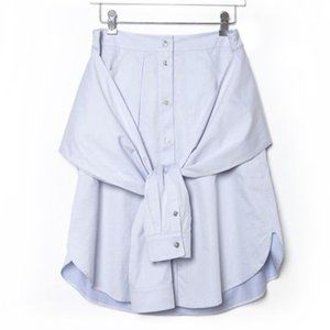 Light blue sheer top by Cynthia Rowley. Long sleeve, sheer organza fabric, mock neck, elongated body.