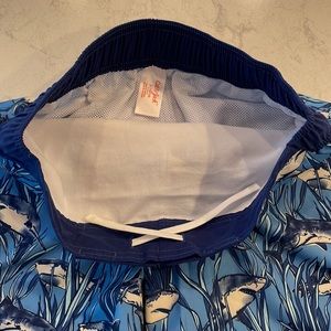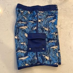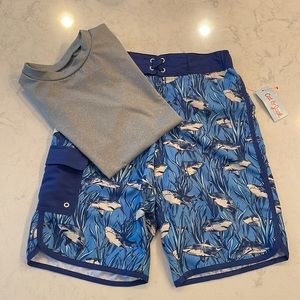 - Shark-print swim trunks bring fun style to his swimwear