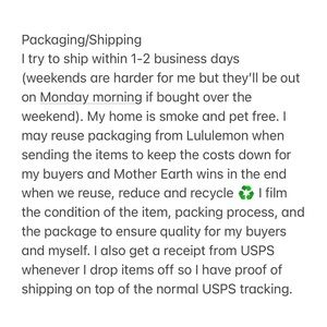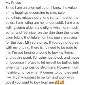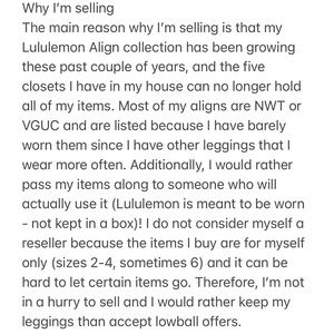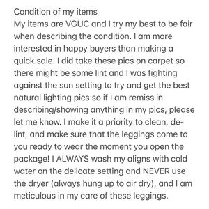 Condition: VGUC. No pilling or flaws. No longer sold by Lululemon. This is a hard to find color in this size and condition. I just don’t wear this color enough to warrant keeping it in my collection.