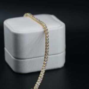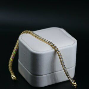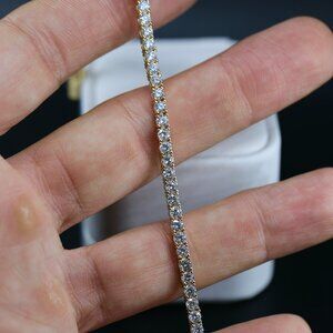 This 6.27 carat tennis bracelet redefines everyday luxury. Fifty-three perfectly matched round brilliant lab-grown diamonds, each 3.2mm in size, are hand-set in solid 14K yellow gold for a seamless line of light. The adjustable 7-inch design ensures both comfort and sophistication — making it a versatile piece suited for both daily wear and evening glamour.