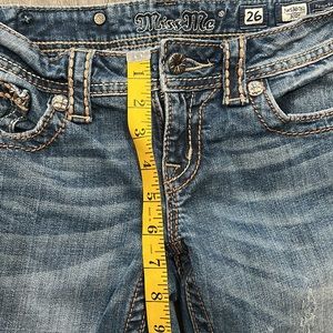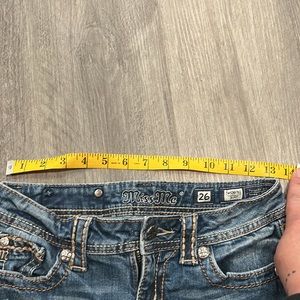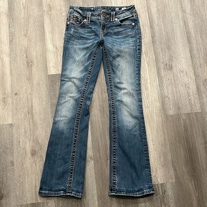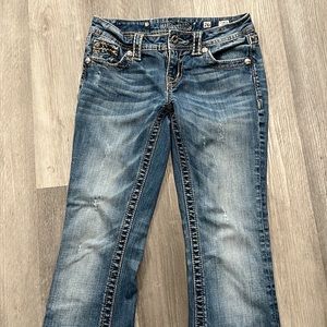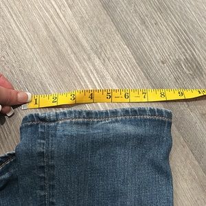 In excellent condition, medium wash & factory distressed, perfectly tapered leg & modest boot cut at bottom hem, beautiful, intricate detailing on back pockets. Questions and offers welcome.