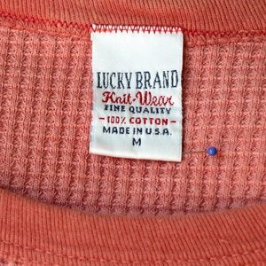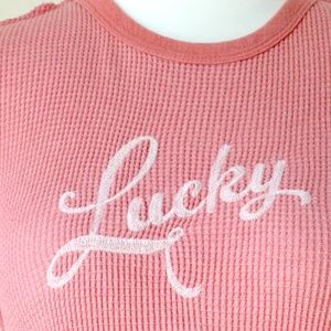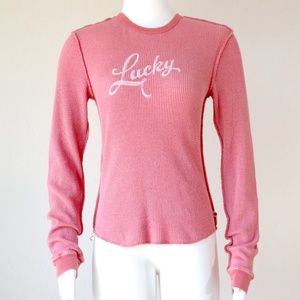 Vintage Lucky Brand long sleeve ribbed knit thermal waffle weave top with "Lucky" embroidered on the front chest