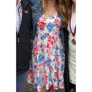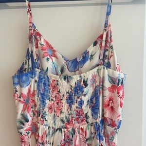 Lovely floral mid length dress with stretchy back and adjustable straps. The perfect dress for graduations, wedding guests, or just running errands in the warmer months!