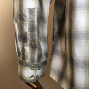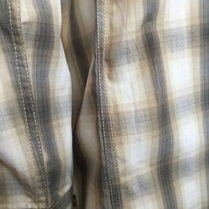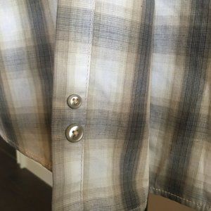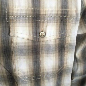 Beautifully Tailored Big Square Cotton Blend shirt with 2 front button pockets. Sleeve and side seams feature top stitching, shoulders have a plackard detail. Hard to see in photos, but there is really nice top stitching details at the pockets that then run from the button to the hem of the shirt.