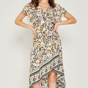 This wrap dress by Hayden LA features a high-low hem and ruffled neckline. Peachy floral and paisley pattern with contrasting hem create a dramatic look. Elastic at the waist allows for a comfortable fit even when tied. 100% rayon. NWT.