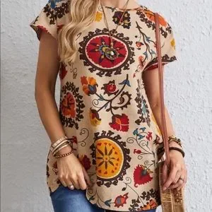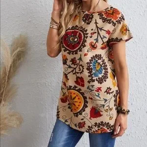 Boho Floral Print Short Sleeve Tunic Top