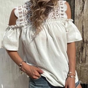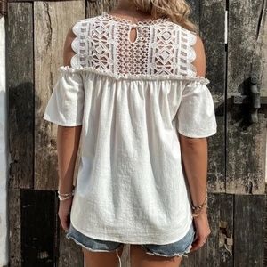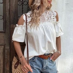 Boho White Lace Cold Shoulder Puff Sleeve Blouse