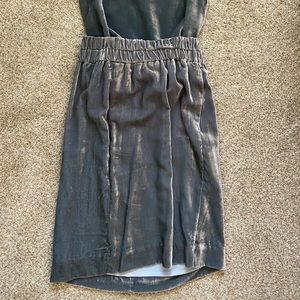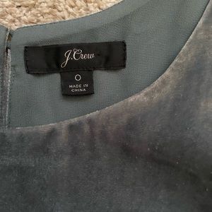 This is a two piece gray velvet set from J Crew. The top is size 0 and has a button closure. The skirt is size XS and has an elastic waist. The tag for the top is missing but the skirt still has its tag attached. The skirt is knee length.