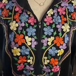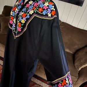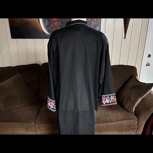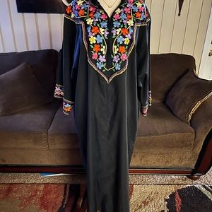 (1970’s) Vintage “Ramona Rull” Kaftan Lounge Dress~ Size Medium. This is in MINT condition with NO tears or stains on the fabric. It has beautiful flower embroideries & gold trim. There is some loose thread on few of flower embroideries.