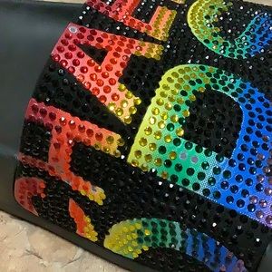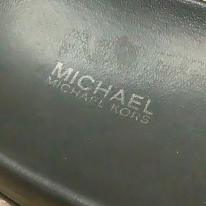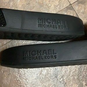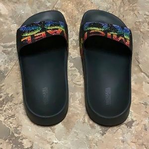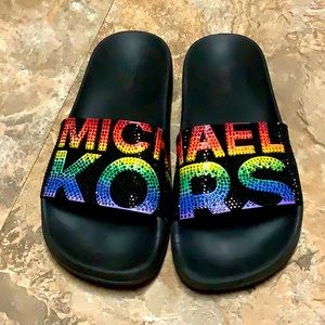 Black Michael Kors slides with thin fabric uppers. The tops are covered in rainbow colored crystals that spell out Michael Kors. The soles are foam rubber. Excellent barely used condition! The one shoe has a few crystals missing on the a the r and the h. other than that they are like brand new condition.