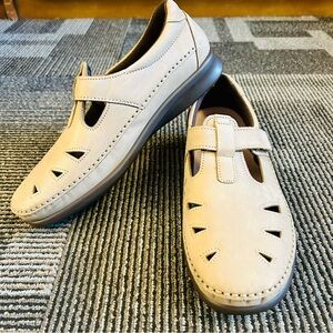 From a pet and smoke free home, these darling go-with-everything flat slingbacks are in brilliant condition: pristine footbeds, minimal scuffing, no creasing across the vamp, and a whisper of treadwear.