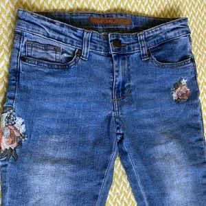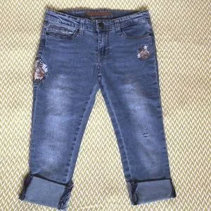 Size 10 girls cropped Joe’s jeans with embroidered patches. Cuffed ankle, with distressed look, brand-new never worn. NWOT