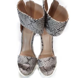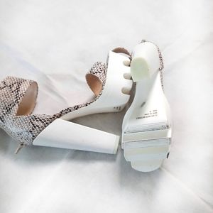 snake print white platform heels, tan and black print heels, peep toe ankle strap heels, thick gum sole heels, zipup