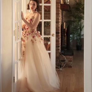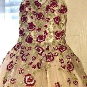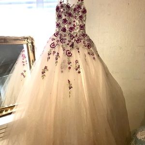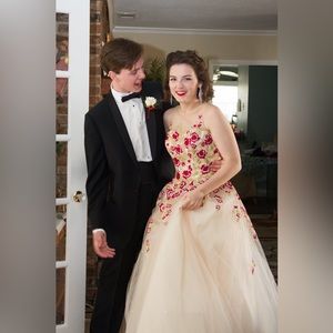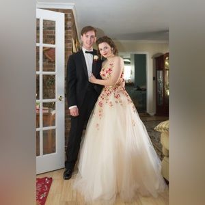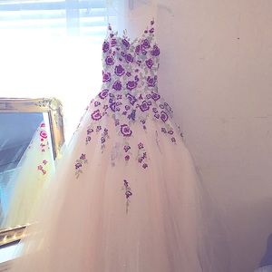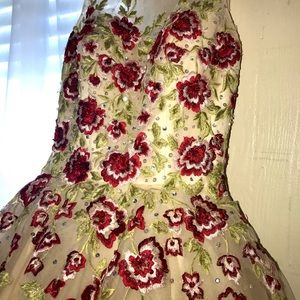 She wore it ONCE to her prom! It’s so much more beautiful in person My photos do NOTHING to show how gorgeous this is! I will try to get some better ones but it’s not a lil dress It has a built in corset & tulle petticoat THE DETAILS ARE INSANE W CRYSTALS THROUGHOUT GIVING IT A SUBTLE SPARKLE ALONG W THE GORGEOUS EMBROIDERED FLOWERS THAT CONTRAST BEAUTIFULLY W THE OFF WHITE COLOR IT IS A LOT LIGHTER THAN MY TERRIBLY LITE PHOTOS WHY I PUT SOME OF HER IN NATURAL LIGHT