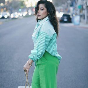 This modern, minimalist topper has a nice tailored fit. Sleek Ponte gives great stretch and sleek lines to the jacket, which has an asymmetrical, fold open collar, gathers details at the elbows, two snap closures at the waist, and flattering seaming throughout. Shoulder pads and a peplum visually narrow the waist and create an hourglass figure. The shorter length of a jacket will hit at the waist and is a perfect partner to the agency skirt or agency trousers for a proper suit. Brand new in factory bag.