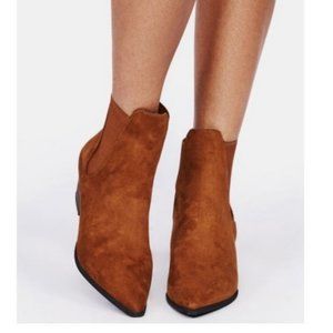 These ankle boots have a faux suede construction, elastic side panels, pointed toes, and mini block heels.