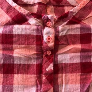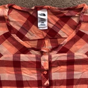 Selling a lovely The North Face summer plaid camping outdoor blouse. Womens M. 100% organic cotton. Concealed buttons on front. A few non concealed add charm. Red and pink and bright peach plaid. Very summery. Cap sleeve. Button detail on sleeve. Drawstring at hem. No flaws, excellent condition.