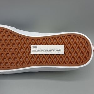 Hi, thanks for looking at my closet. These shoes are new with the tag and extra laces, they may have been tried on but not worn out of the store. I don't have the entire original box but I have the side flap with the shoe information that I'll include. They are a men's size 7.5 and while not marked, this is equivalent to a women's size 9 according to the Vans size chart. The Vans model number is: VN0A34790QF. These have a suede Navy section with the canvas cream or off white color section and then the red accent on the back heel.