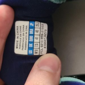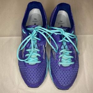 These purple and aquamarine running shoes have some replacement Brooks Running insoles.